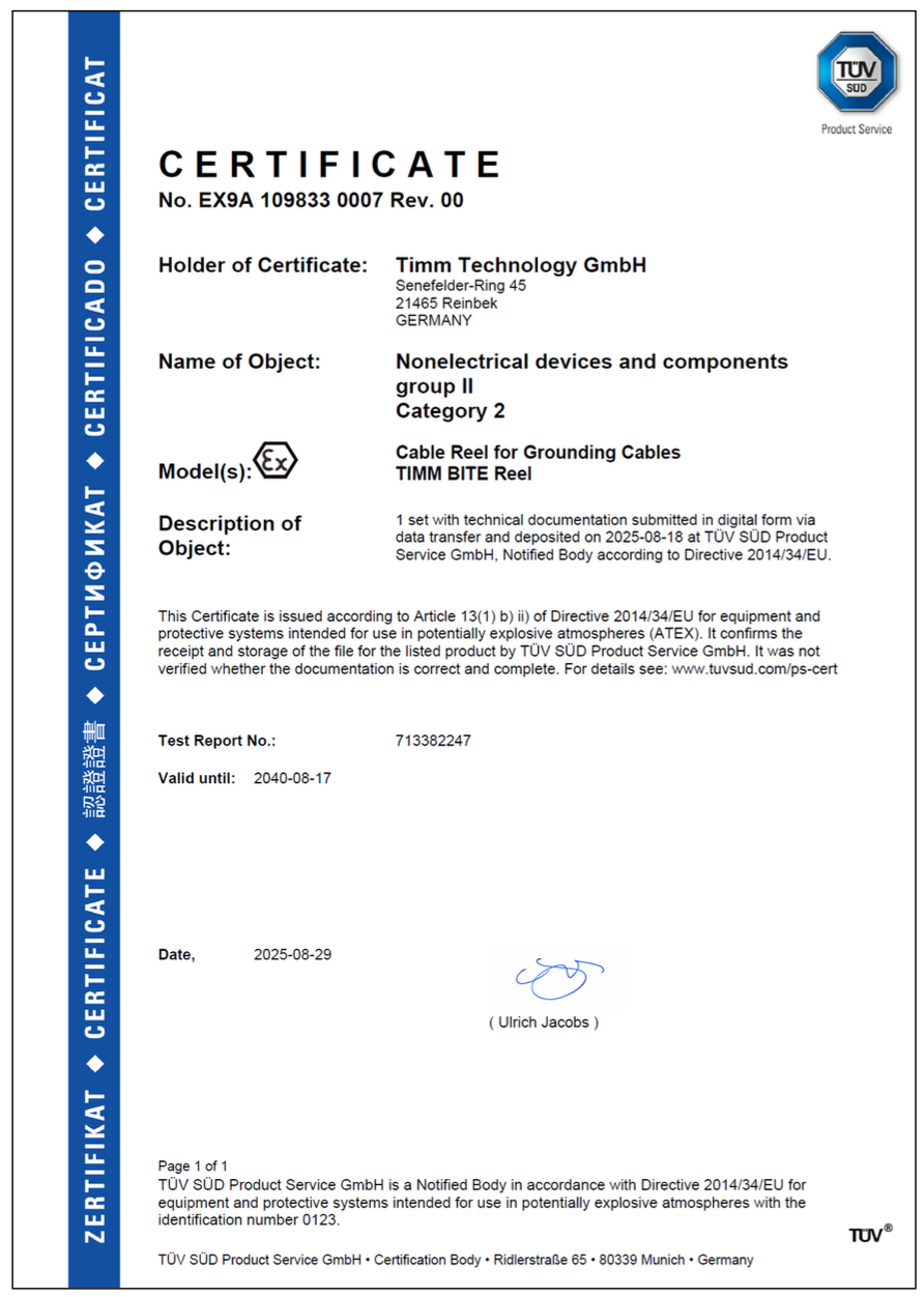 TBREEL7 TIMM BITE Reel – 7 m explosionsgeschützter Kabelaufroller mit Erdungszange